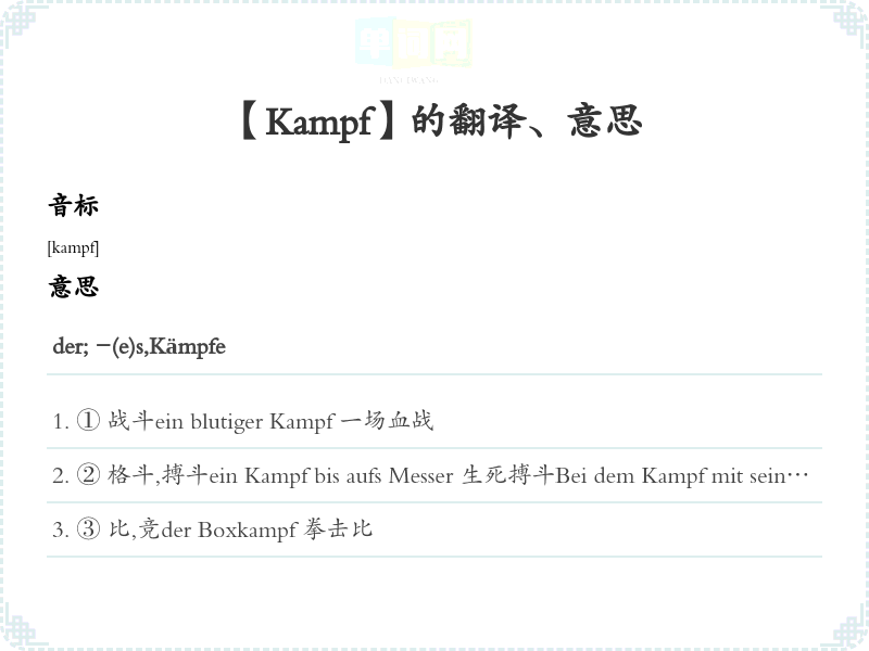 ④ 斗争;奋斗der ideologische Kampf 意识形态的斗争der Kampf gegen die Umweltverschmutzung, für den Frieden 为反对环境污染,为和平而斗争