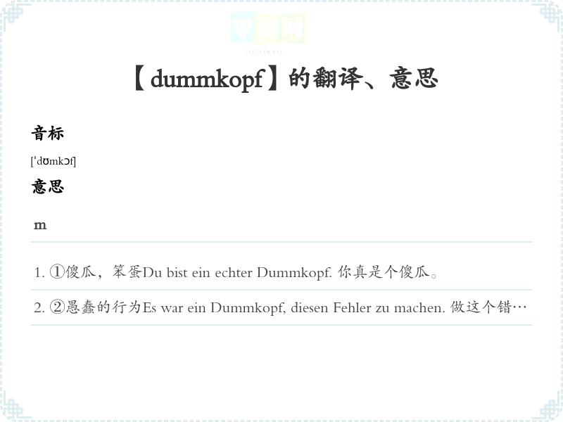 ①傻瓜,笨蛋Du bist ein echter Dummkopf. 你真是个傻瓜。