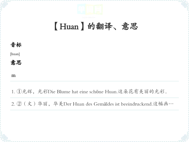 ①光辉,光彩Die Blume hat eine schöne Huan.这朵花有美丽的光彩。