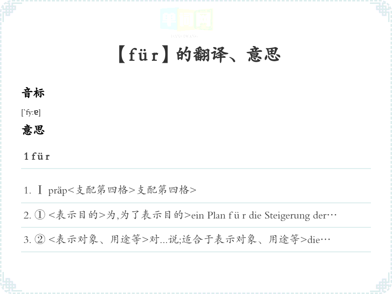 ⑩ <>Schritt für Schritt seinem Ziel näherkommen 逐步地接近目标Stueck für Stueck untersuchen 逐件检查Tag für Tag 日复一日,一天天einen Text Wort für Wort übersetzen 逐字逐句地翻译一篇文章Mann für Mann trat vor. 一个挨着一个出列。⑾<表示可能性>表示可能性>Nimm für alle Fälle etwas Geld mit! 带点去,以防万一!Für den Fall, dass es regnet... ...以防下雨⑿<与was构成固定搭配:was für="" (ein,="" eine,="" ein)...=""> →was I与was构成固定搭配:was>⒀<受某些动词、形容词的支配>受某些动词、形容词的支配>j-n/etw. eintreten 为某人,某事辩护etw. für richtig halten 认为...正确sich für etw. Interessieren 对...有兴趣für etw. kämpfen 为某事而斗争für j-n/etw. sorgen 关心某人/某事Genug für heute! 今天就到这儿!Ⅱ adv.[诗]永久,永远2 Fürdas赞成,拥护