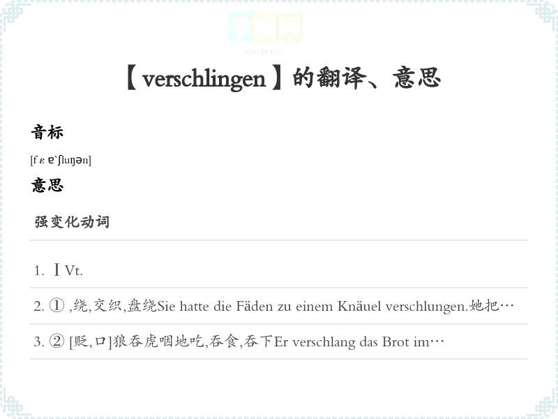 ③ 耗尽,吞掉,挥霍Die große Sturmflut hatte Menschen und Land verschlungen.洪水吞没了人们和土地。Der Bau wird Millionen verschlingen.这项建设要耗费几百万元。Ⅱ refl.纠,绕在一Der Faden verschlang sich zu einem Knoten.线绕成了一个语法搭配sich+四格, +四格, zu+三格