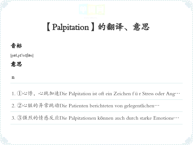 ②心脏的异常跳动Die Patienten berichteten von gelegentlichen Palpitationen.病人报告偶尔出现心悸。