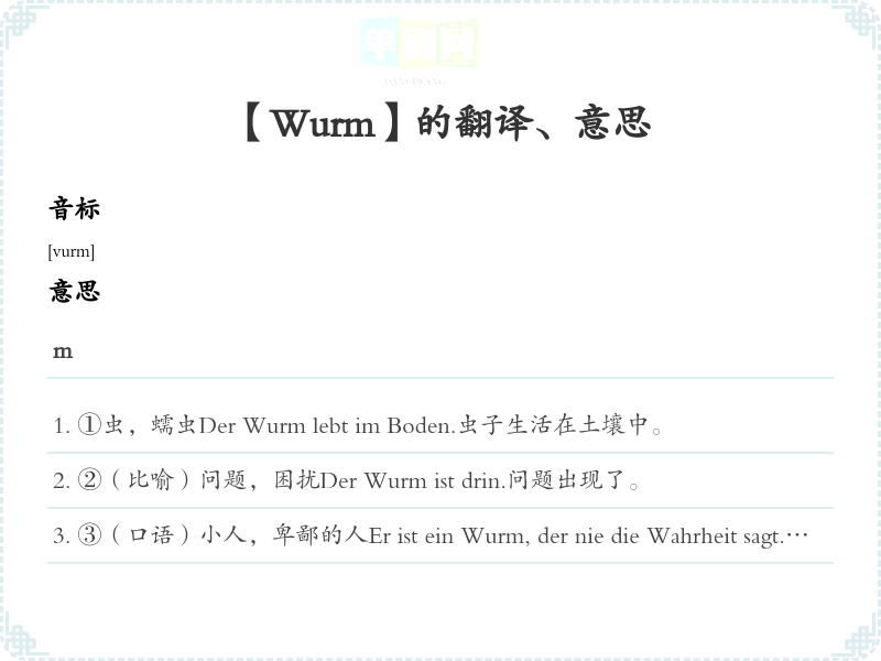 ①虫,蠕虫Der Wurm lebt im Boden.虫子生活在土壤中。