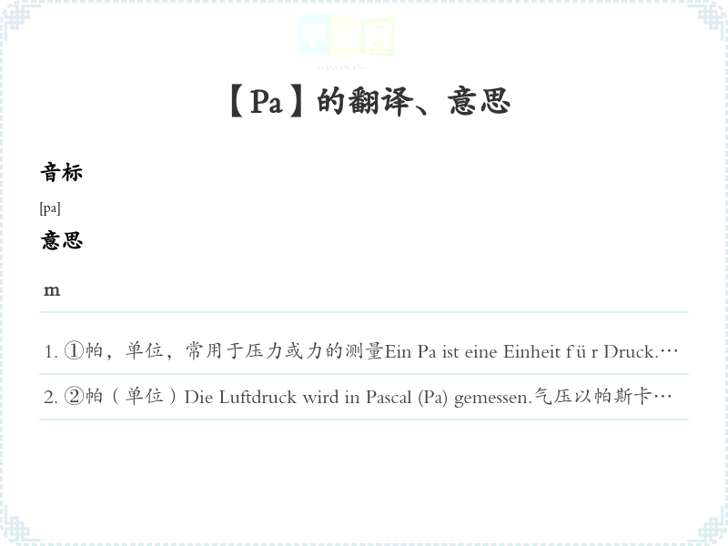 ①帕,单位,常用于压力或力的测量Ein Pa ist eine Einheit für Druck.一个帕是压力的单位。