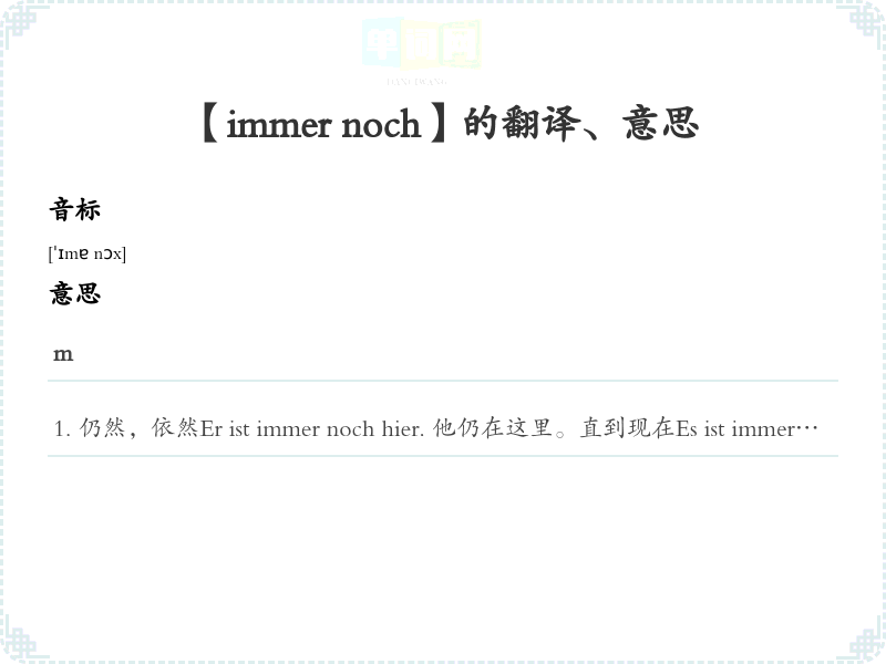 仍然,依然Er ist immer noch hier. 他仍在这里。直到现在Es ist immer noch nicht klar. 到现在仍然不清楚。