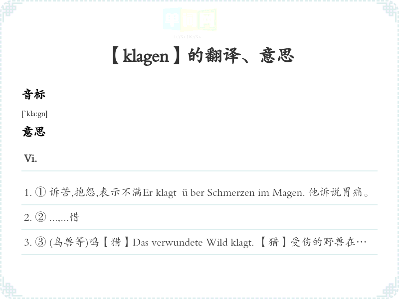 ④ 【律】起诉,申诉,控告auf Schadenersatz klagen 【律】提出赔偿损失的诉讼Mein Rechtsanwalt riet mir, gegen den Nachbarn zu klagen. 我的律师建议我向邻居起诉。Vt.