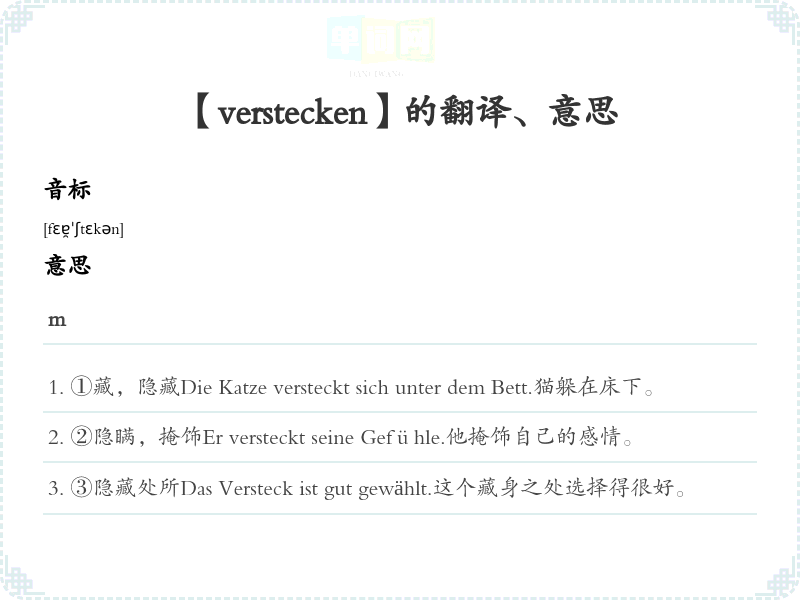 ②隐瞒,掩饰Er versteckt seine Gefühle.他掩饰自己的感情。