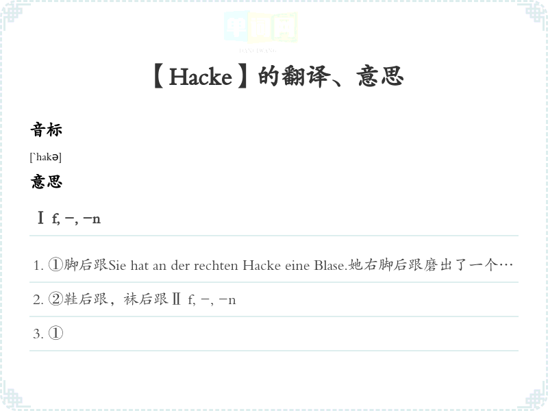 ①脚后跟Sie hat an der rechten Hacke eine Blase.她右脚后跟磨出了一个泡。