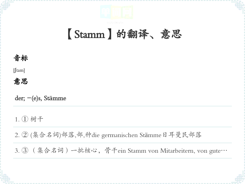 ③ (集合名词)一批核心,骨干ein Stamm von Mitarbeitern, von guten Spielern im Team 一批工作骨干,队里一批骨干运动员