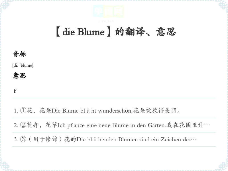 ③(用于修饰)花的Die blühenden Blumen sind ein Zeichen des Frühlings.盛开的花朵是春天的标志。