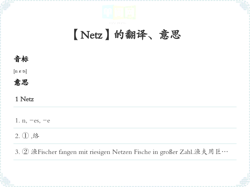 ① (交通)系统,络Deutschland hat ein gut ausgebautes Netz von Autobahnen.德国有四通八达的络系统。In Deutschland bilden Autobahnen ein Netz, das nicht nur Großstädte verbindet.在德国,高速公路形成了一个不仅是连接到大城市的交通系统。