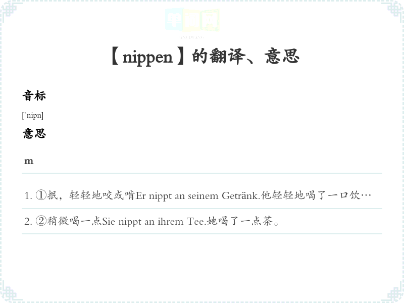 ①抿,轻轻地咬或啃Er nippt an seinem Getränk.他轻轻地喝了一口饮料。