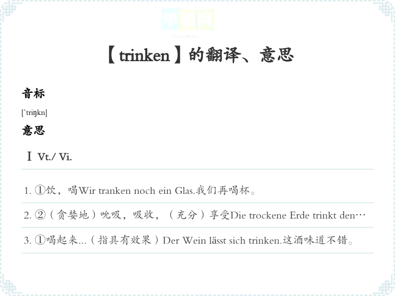 ①饮,喝Wir tranken noch ein Glas.我们再喝杯。