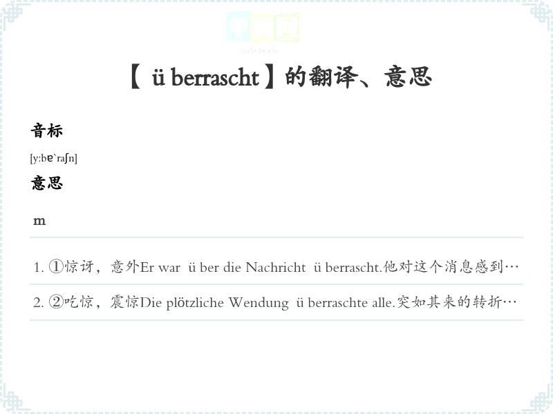 ②吃惊,震惊Die plötzliche Wendung überraschte alle.突如其来的转折让大家感到吃惊。