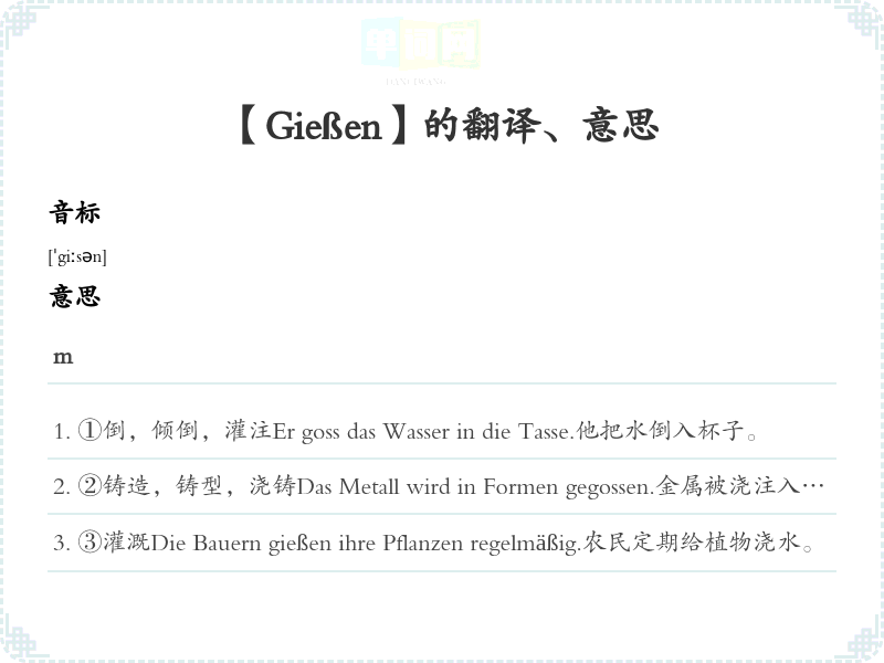 ①倒,倾倒,灌注Er goss das Wasser in die Tasse.他把水倒入杯子。