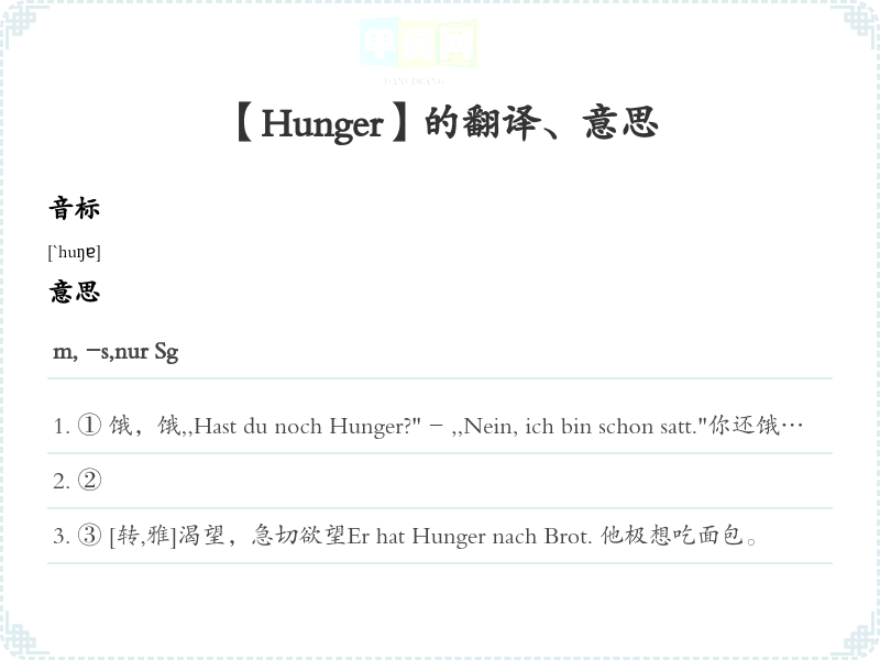 ③ [转,雅]渴望,急切欲望Er hat Hunger nach Brot. 他极想吃面包。