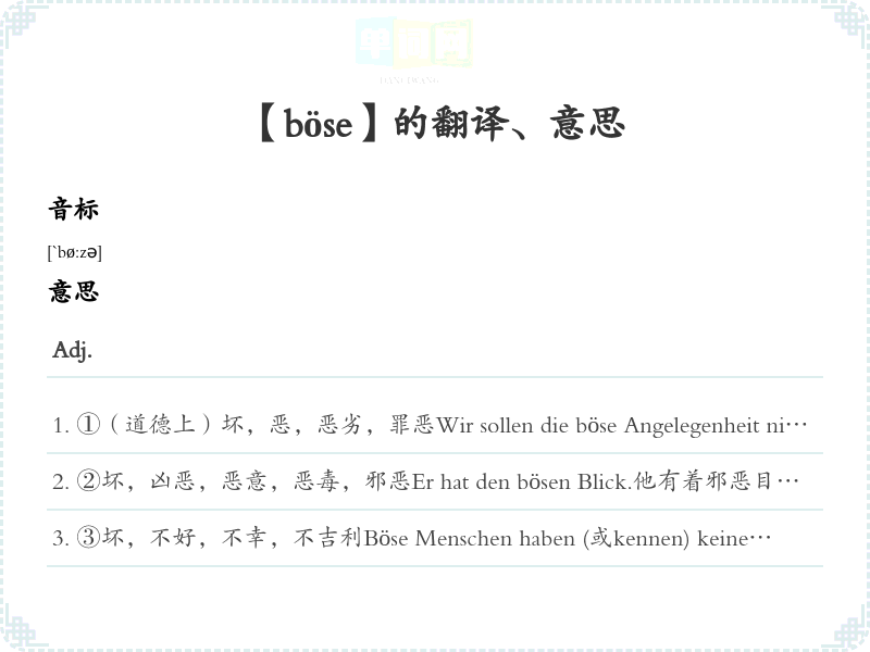 ①(道德上)坏,恶,恶劣,罪恶Wir sollen die böse Angelegenheit nicht machen.我们不应该做坏事。