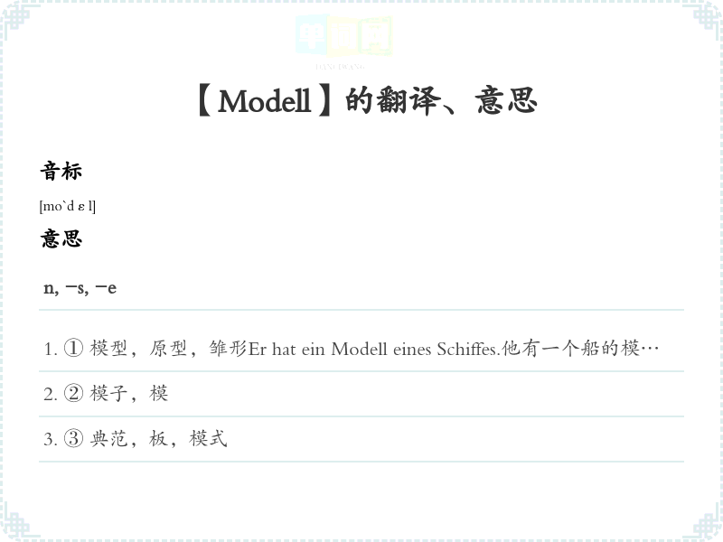 ① 模型,原型,雏形Er hat ein Modell eines Schiffes.他有一个船的模型。