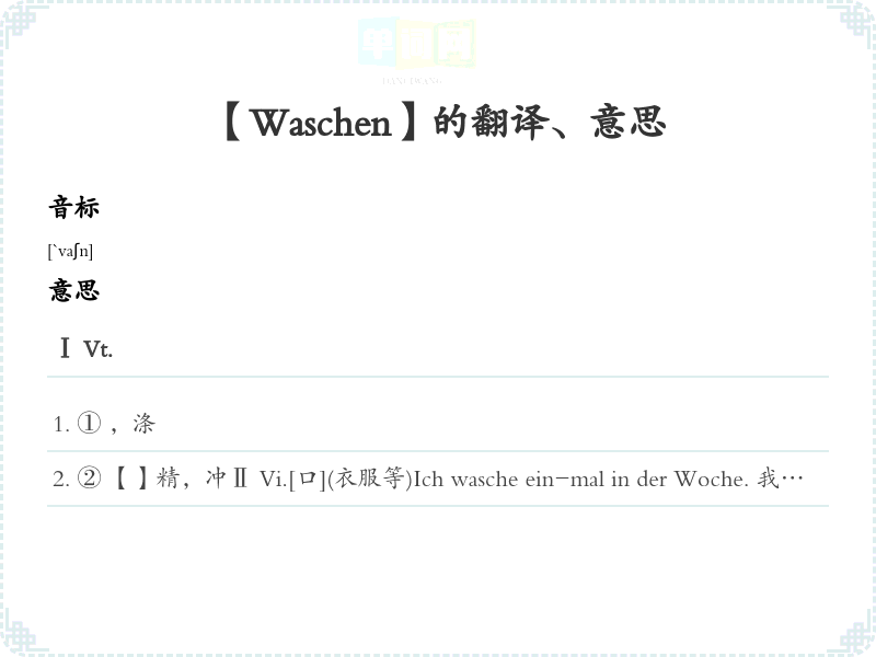 [口](衣服等)Ich wasche ein-mal in der Woche. 我每星期一次衣服。Ⅲ Vi(s.)【海】冲击,淹没Die Wogen waschen über das Deck. 大浪冲上甲板。Ⅳ Vr.,涤Ich wasche mich morgens und abends. 我早晚脸(或澡)。语法搭配+四格, sich+三格, sich+四格
