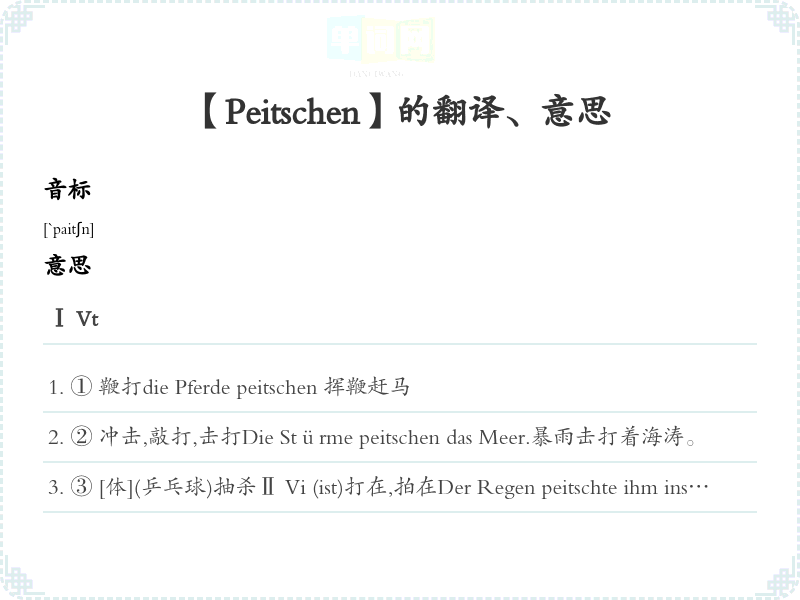 ③ [体](乒乓球)抽杀Ⅱ Vi (ist)打在,拍在Der Regen peitschte ihm ins Gesicht. 雨打在他的脸。语法搭配+四格
