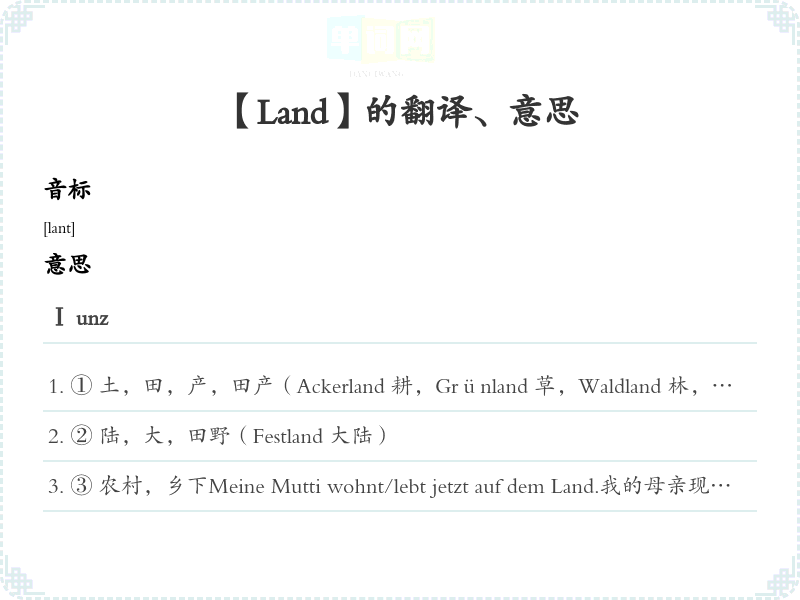 ① 土,田,产,田产(Ackerland 耕,Grünland 草,Waldland 林, Weideland 牧场)Wir haben zehn Hektar Land.我们有十公顷土。Wir haben noch ein Stück Land.我们还有一块田。