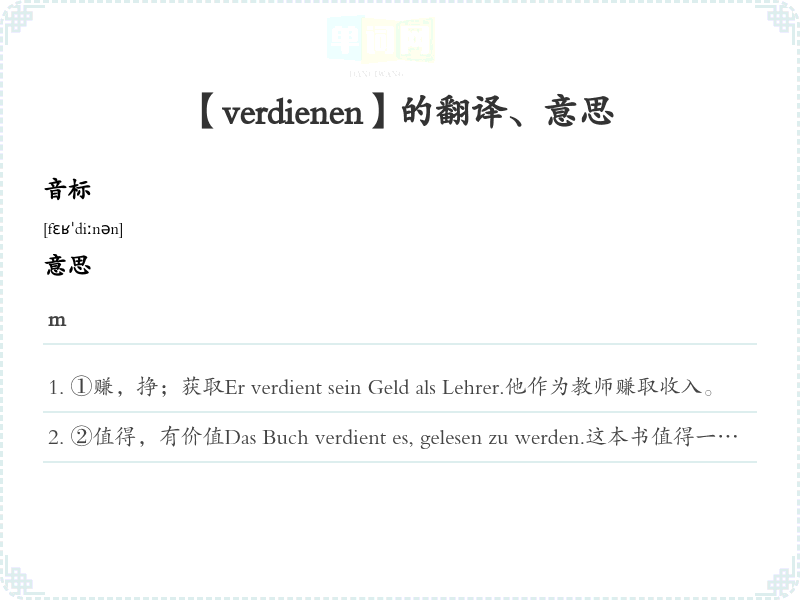 ①赚,挣;获取Er verdient sein Geld als Lehrer.他作为教师赚取收入。