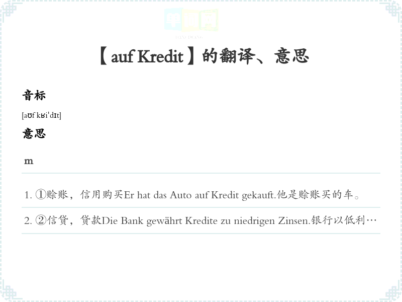 ①赊账,信用购买Er hat das Auto auf Kredit gekauft.他是赊账买的车。