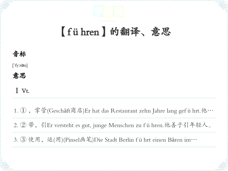 ② 先的,占首位的Unsere Produkte sind führend.我们的产品质量是先的。Ⅳ refl.(行为)表现Wie hat sich der Junge in der Schule geführt?这男孩在学校表现如何?语法搭配sich+四格, +四格, mit+三格, zu+三格, nach+三格, um+四格