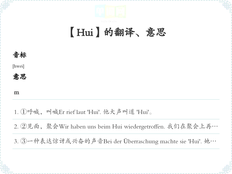 ③一种表达惊讶或兴奋的声音Bei der Überraschung machte sie 'Hui'. 她惊讶时发出了 'Hui' 的声音。