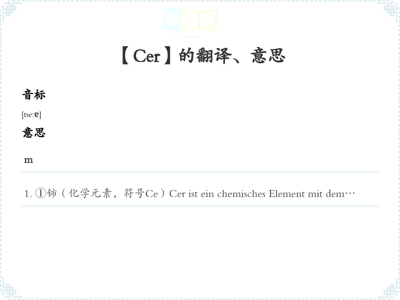 ①铈(化学元素,符号Ce)Cer ist ein chemisches Element mit dem Symbol Ce und der Ordnungszahl 58.