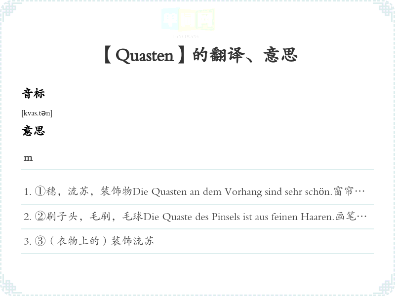 ①穗,流苏,装饰物Die Quasten an dem Vorhang sind sehr schön.窗帘上的流苏非常漂亮。