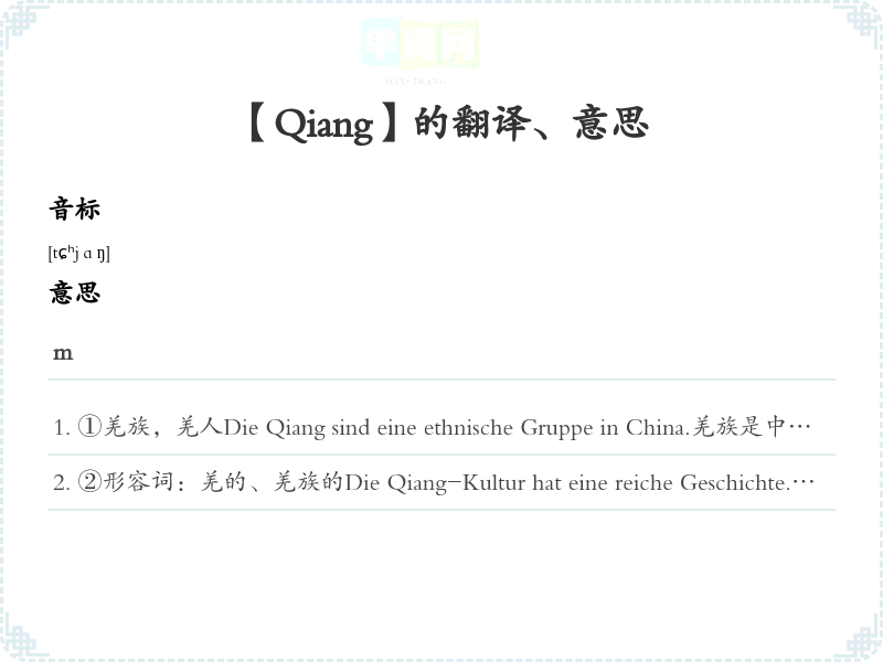 ②形容词:羌的、羌族的Die Qiang-Kultur hat eine reiche Geschichte.羌文化有着丰富的历史。