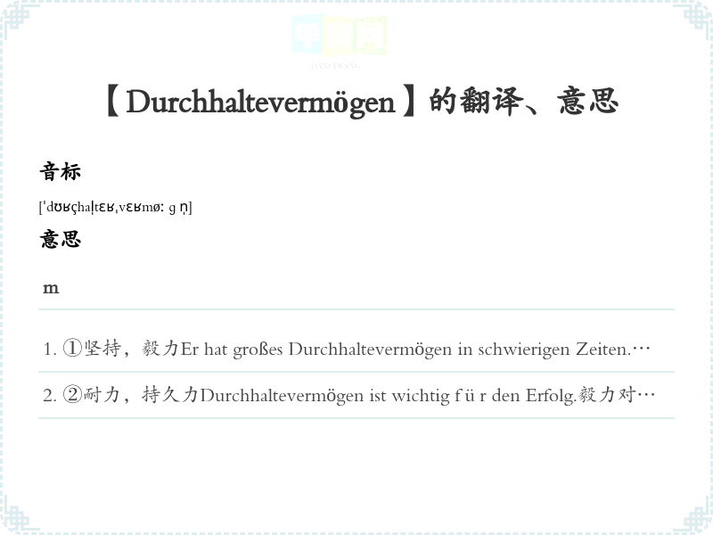 ①坚持,毅力Er hat großes Durchhaltevermögen in schwierigen Zeiten.他在困难时期有很大的毅力。