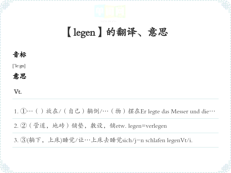 ①(物主)减弱,缓和,息Nachdem sich der Sturm gelegt hatte, fuhren sie auf den See hinaus.风暴息后,他们驾艇到湖上去了。etwas an den Tag legen显示出做某事auf A legen 重视sich(Akk.) ins Zeug legen使劲jmdn. aufs Kreuz legen欺诈sich(Akk.) ins gemachte Bett legen坐享其成sich(Akk.) mächtig ins Zeug legen 埋头苦干,再接再厉die Hände in den Schoß legen无所事事Das Huhn, das goldene Eier legt, schlachten.竭泽而渔。Die Gans, die goldene Eier legt, schlachten.竭泽而渔。语法搭配sich+四格, +四格, in+四格, auf+四格, hinter+四格, zwischen+四格, neben+四格, über+四格, unter+四格 德 语 助 手