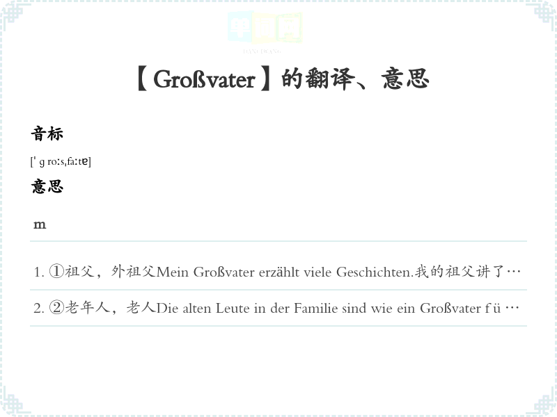 ②老年人,老人Die alten Leute in der Familie sind wie ein Großvater für die Kinder.家庭中的老人就像孩子们的祖父。