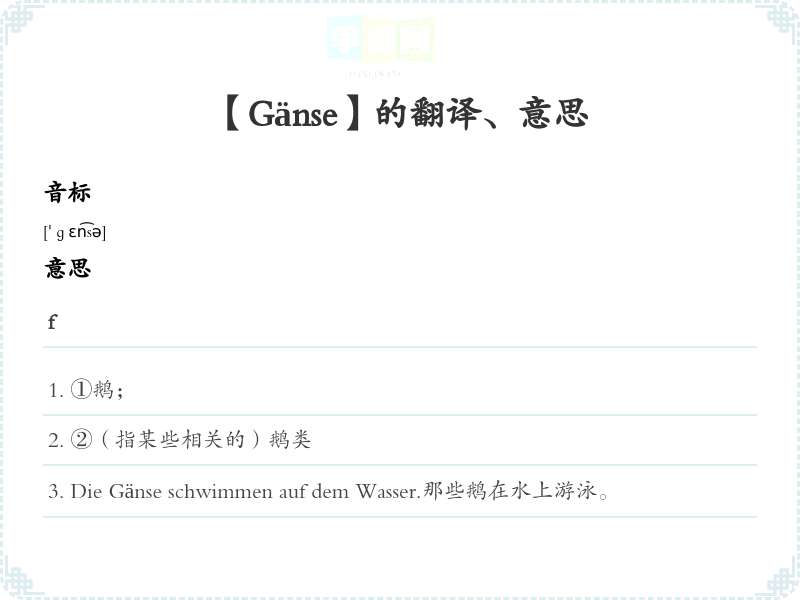Die Gänse schwimmen auf dem Wasser.那些鹅在水上游泳。