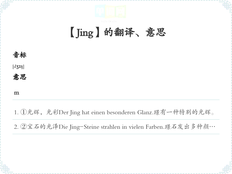 ①光辉,光彩Der Jing hat einen besonderen Glanz.璟有一种特别的光辉。