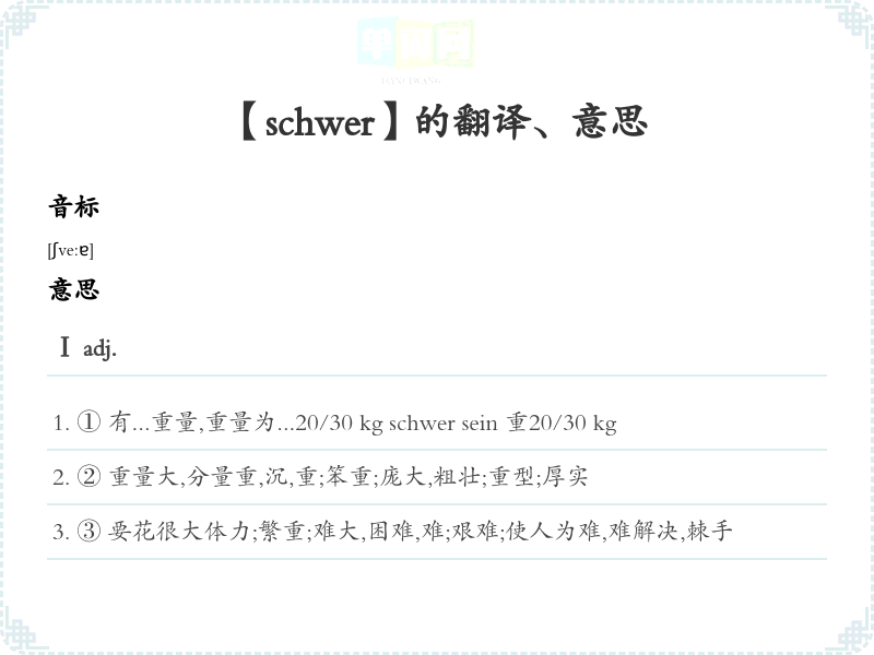 ⑧ 可观,很多Ⅱ adv.很,非常schwer arbeiten 努力工作es schwer haben ...很难schwer bepackt sein 装得很满schwer beleidigt sein 被深深伤害schwer betrunken 很醉
