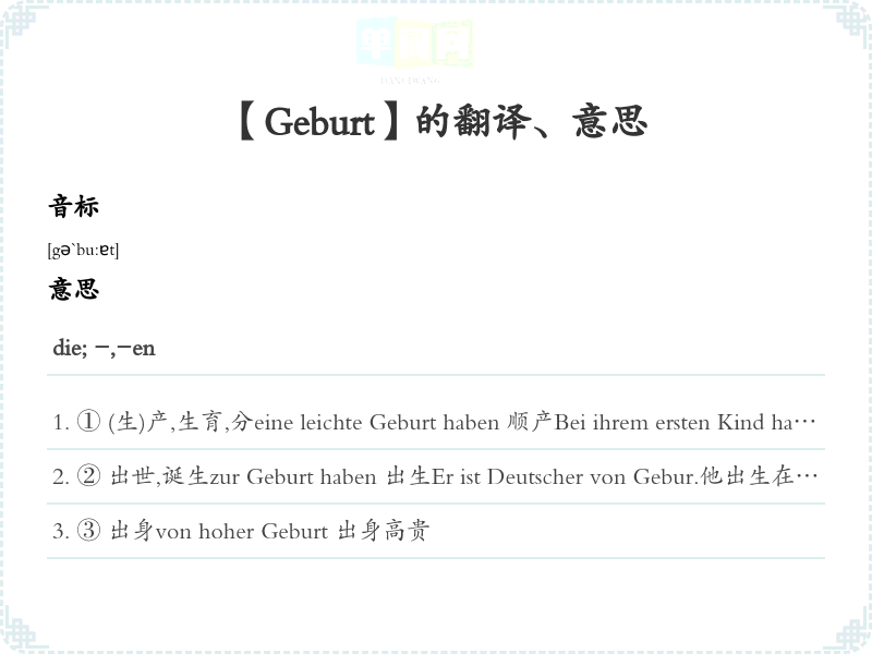② 出世,诞生zur Geburt haben 出生Er ist Deutscher von Gebur.他出生在德国。