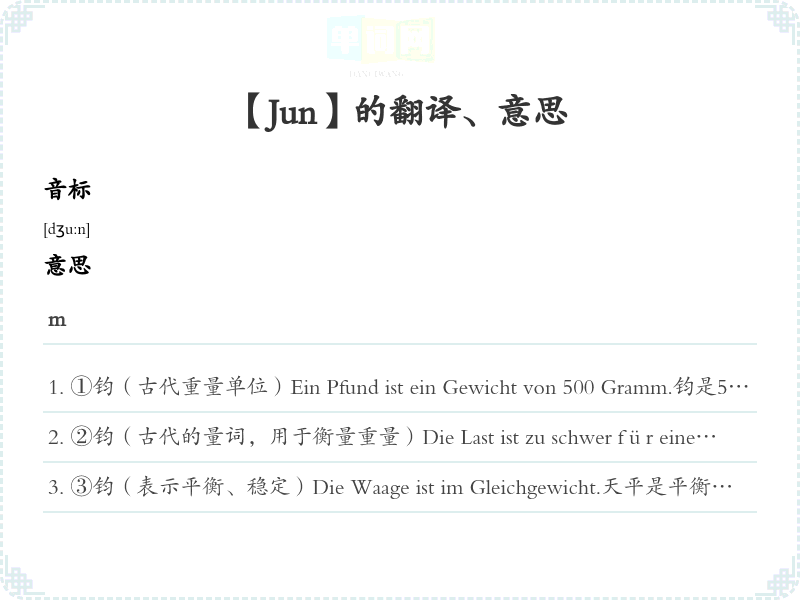 ①钧(古代重量单位)Ein Pfund ist ein Gewicht von 500 Gramm.钧是500克的重量单位。