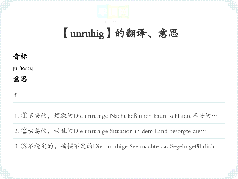 ①不安的,烦躁的Die unruhige Nacht ließ mich kaum schlafen.不安的夜让我几乎无法入睡。