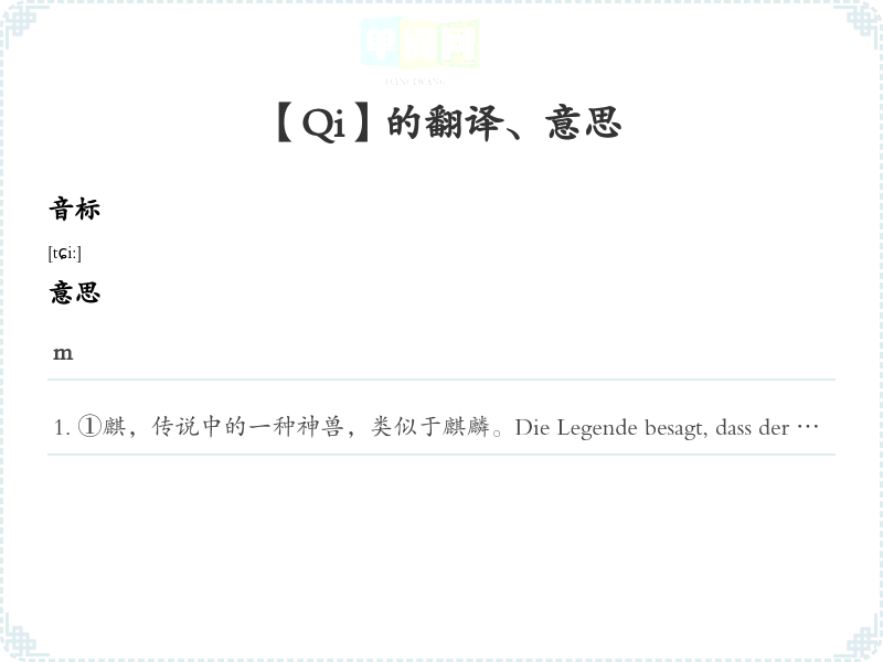 ①麒,传说中的一种神兽,类似于麒麟。Die Legende besagt, dass der Qi ein heiliges Wesen ist, das Glück bringt.
