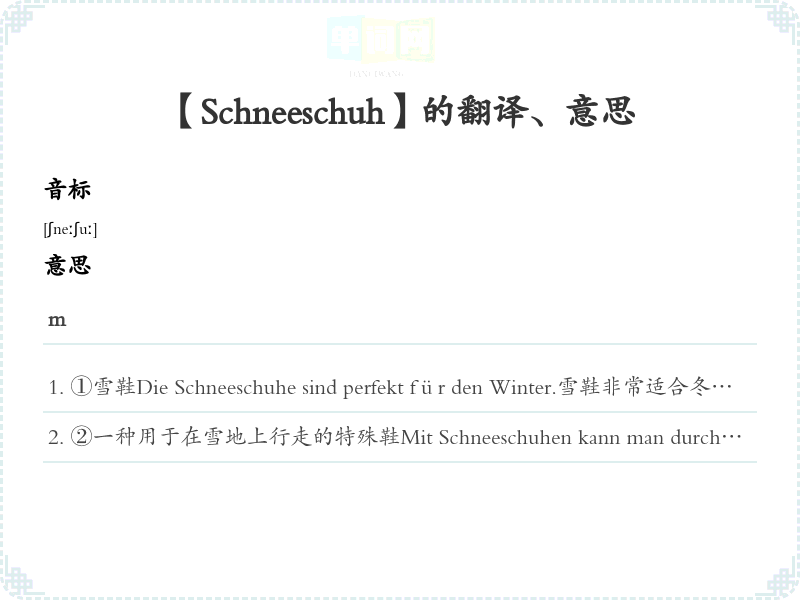 ②一种用于在雪地上行走的特殊鞋Mit Schneeschuhen kann man durch den tiefen Schnee laufen.穿着雪鞋可以在深雪中行走。