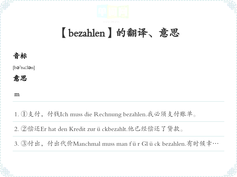 ①支付,付钱Ich muss die Rechnung bezahlen.我必须支付账单。