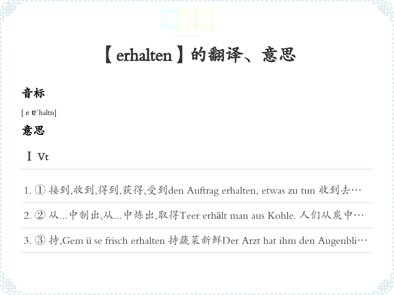① 接到,收到,得到,获得,受到den Auftrag erhalten, etwas zu tun 收到去做某事任务eine Antwort erhalten 得到答复