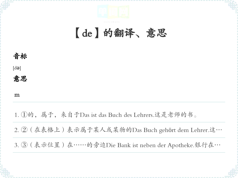 ①的,属于,来自于Das ist das Buch des Lehrers.这是老师的书。