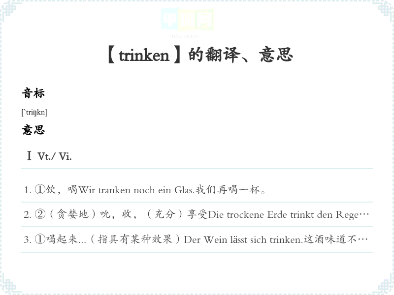 ①饮,喝Wir tranken noch ein Glas.我们再喝一杯。