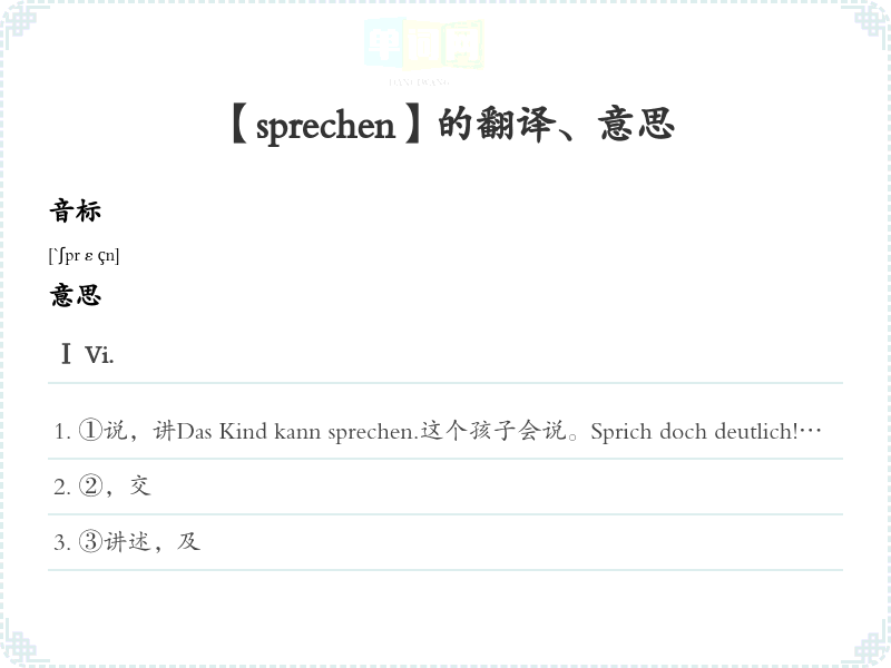 ①说,讲Das Kind kann sprechen.这个孩子会说。Sprich doch deutlich!说清楚点!Er spricht mit französischem Akzent.他说带有法国口音。