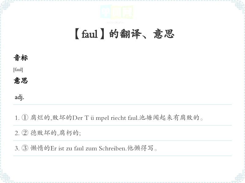 ① 腐烂的,败坏的Der Tümpel riecht faul.池塘闻起来有腐败的。
