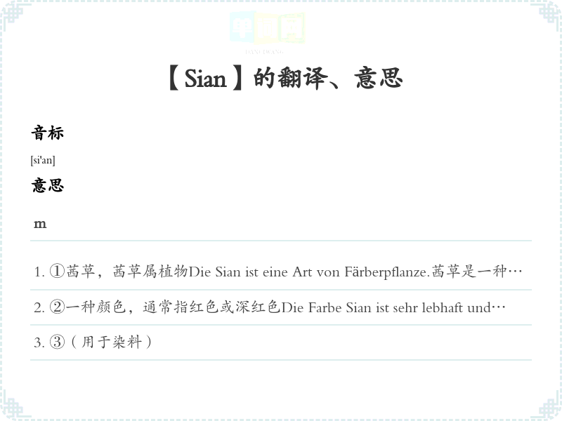 ②一种颜色,通常指红色或深红色Die Farbe Sian ist sehr lebhaft und ansprechend.茜色非常鲜艳而吸引人。